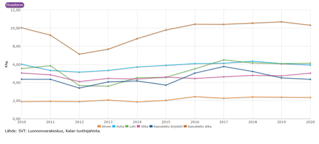 Tärkeimpien rannikkokalastuksen saalislajien hinnat laskivat tai pysyivät suunnilleen samana kuin edellisvuonna. Luonnonlohen (6,13 euroa kilolta) ja ahvenen (2,36 euroa kilolta) hinnat pysyivät edellisvuoden tasolla, kun taas kuhan (5,93 euroa kilolta) ja hauen (2,05 euroa kilolta) tuottajahinnat laskivat hieman edellisvuodesta. Merestä pyydetyn siian (5,04 euroa kilolta) ja mateen (5,58 euroa kilolta) hinnat sen sijaan nousivat verrattuna vuoteen 2019.