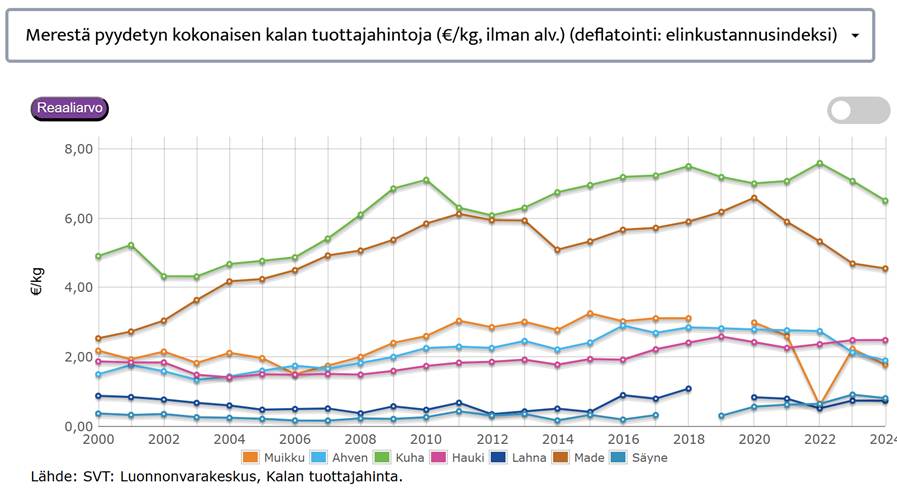 Kalan tuottajahintatilasto kuvaa Suomen merialueen satamiin puretun kalan tuottajahintaa.